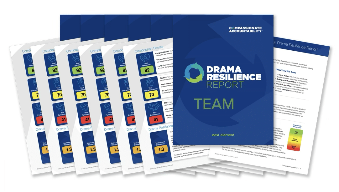 Start with the Drama Resilience Report for one leader, or choose the Drama Resilience Team Report to see what is really happening across the team.